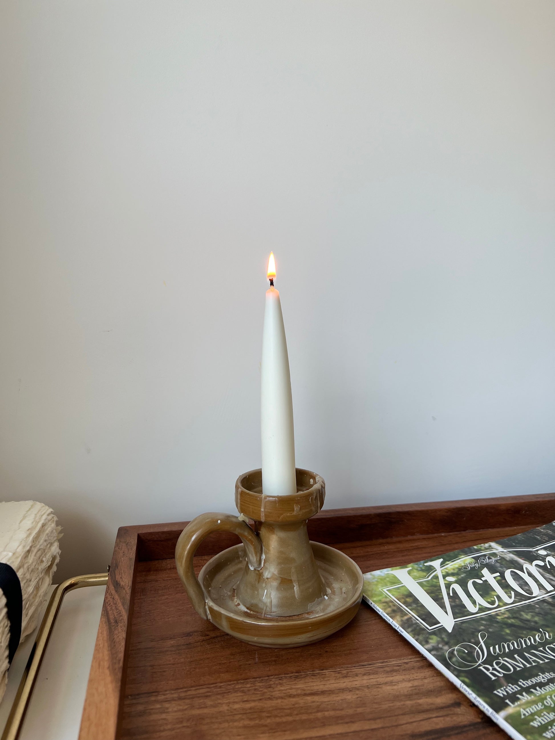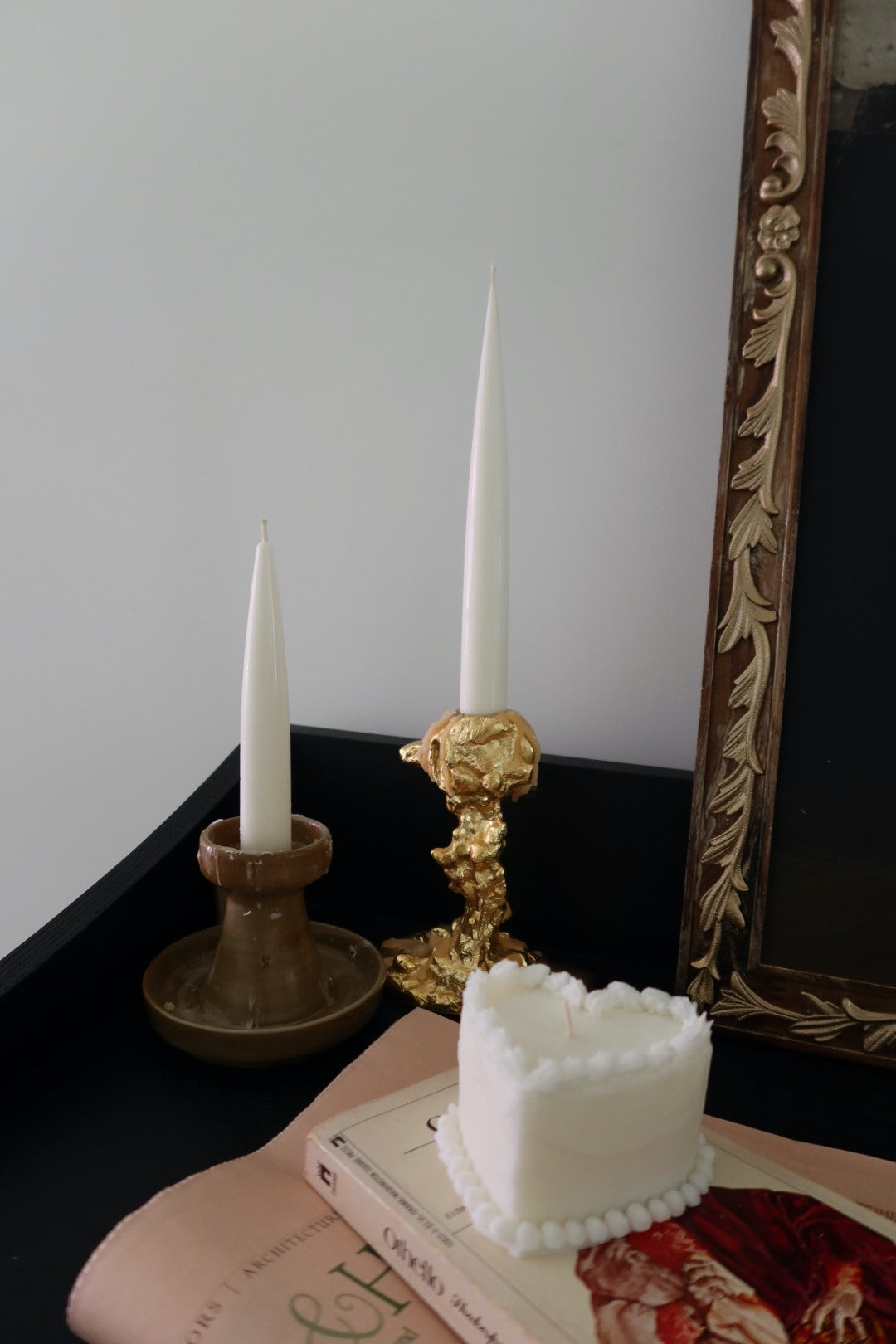 The small Yve taper candle is made with a custom blend of soy and beeswax. Hand poured and made to order.